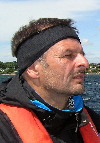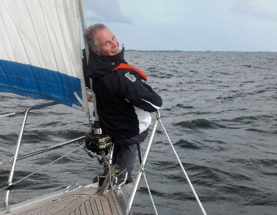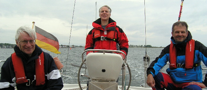 Die Crew ist immer noch guter Dinge und segelt zunächst bei wenig Wind rüber nach Burgstaaken. Wir sehen hier Thomas am Ruder, der schon bald wieder ein Schauer auf sich, nein auf uns!!! ziehen wird. Ein Mythos? Leider nein. Wir werden wieder mal so richtig nass, aber Thomas’ erprobte Steuermannskunst bei schwierigsten Wetterbedingungen ist einfach nicht zu toppen.