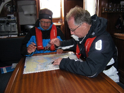 Crew - im Bild Edi und Thomas bei der Törnplanung - die Yacht durch die für