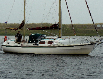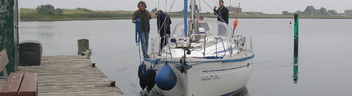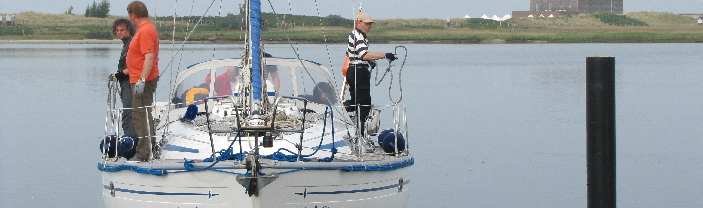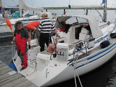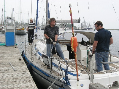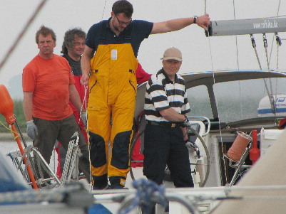 Dann bekommt Ralf Besuch von seinem Freund Uli (links) und die Crew gleich mit. Geschichten aus dem Leben eines Einhandseglers und der Besuch auf seiner "Mercy" bilden eine interessante Ergänzung des Trainings. So ganz nebenbei hat Uli jede Menge Fotos von unseren Manövern geschossen. Dafür und für den herrlichen Rotwein herzlichen Dank.