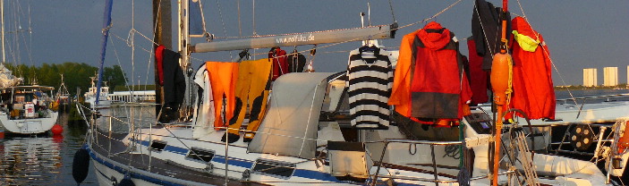 Na klar haben wir herrliches Wetter, doch bei der Überfahrt nach Burgstaaken kommt es ganz schön Dicke. Der Wind ratzfatz in Böen von 0 auf 7 Bft., dazu schaurige Schauer, Gewitter und am Ende mutiert die Blisterschot zur Wäscheleine - unten.