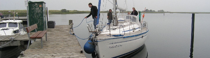 ... über die Stegklampe langsam die Fahrt bremsen, danach mit der Achterleine das Heck dicht holen. Steht das Boot wird aus der Vorspring eine Vorleine, das reicht für's kurzzeitige Tanken. Beim Tanken natürlich Maschine aus, Putzlappen und Spülmittel bereit halten - falls mal was daneben geht.