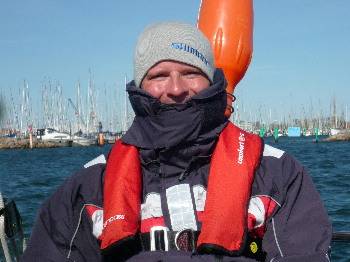 An der „Verkleidung“ lässt sich gut die Temperatur und der eiskalte Ostwind dieser Tage ablesen, doch die Crew bekommt zum Frieren erst gar keine Gelegenheit, immer wieder geht auf dem „SKS-Spielplatz“ vor Heiligenhafen die Boje über Bord. Zunächst unter Maschine – Achtung nicht alle Prüfer verlangen, dass Heck wegzudrehen, aber Du musst in jedem Fall die Maschine auskuppeln!