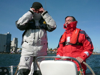 Die Crew liefert ihren Skipper pünktlich um 0845 zur Skipperbesprechung beim Prüfungsausschuss ab, aber wir werden erst als drittes Boot an die Reihe kommen und lange warten müssen. Wir nutzen die Steilvorlage, legen als erstes Boot ab, proben alle Manöver unter den heutigen Bedingungen und legen uns dann an den Deviationsdalben, der Prüfer wird später übersteigen, wir sind auf Kanal 69 auf standby.