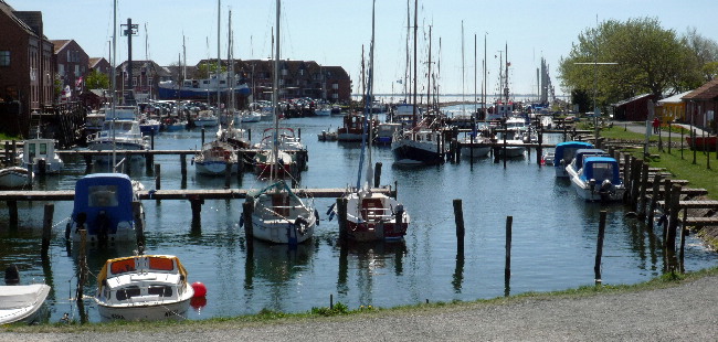 In Bagenkop (links der Blick vom Turm) manövriert uns Sibylle zwischen die Pfähle. Anfang Mai ist kaum Betrieb in dem sonst so quirligen Hafen.