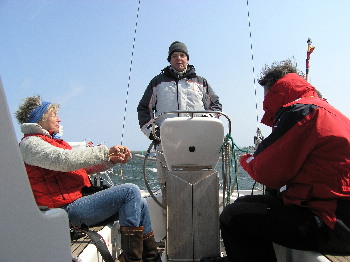 Die Sonne scheint vier Tage lang aus allen Knopflöchern und der eiskalte Nordost pustet uns dabei so heftig durch, dass wir unser Programm nicht so wie geplant durchführen können. Für ein paar Stunden müssen wir uns in geschützte Winkel in holy harbour oder in Orth auf Fehmarn "verstecken". Einige heftige Manöver stürzen das Getriebe so tief ins Chaos, dass der VolvoPenta nur noch von den zauberhaften Händen eines stadtbekannten Schiffsmechanikers wieder zum Leben erweckt werden kann. Danke Holger, der nächste Kuchen kommt bestimmt.
