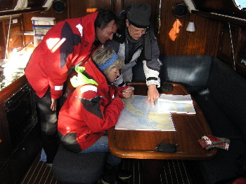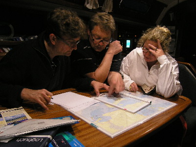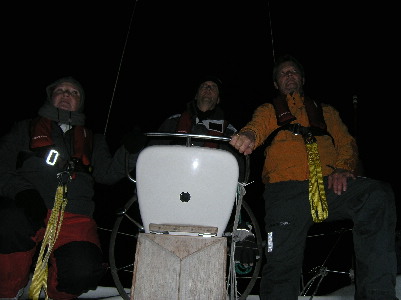 Links im Bild bereitet sich die Crew intensiv auf die erste Nachtfahrt ihrer Karriere vor. Leicht ist die Aufgabe jedenfalls nicht. Du kannst nächtelang geradeaus über den Atlantik segeln, ohne ein Feuer oder Fahrzeug zu sehen, aber von Burgstaaken nach Heiligenhafen findest Du in rund drei Stunden mehrere Richtfeuer, Sektorenfeuer, Quermarkenfeuer und alle möglichen Lateral- oder Kardinaltonnen. Die meisten davon sind nicht befeuert und das macht diese Nachtfahrt für Einsteiger durchaus zu einer Herausforderung. Dazu muss sauber in der Richtfeuerlinie gesteuert werden - aus Burgstaaken raus sogar mit dem Blick in das rückwärtige Richtfeuer. Wer sich hier "verfährt" riskiert immer die Kollision mit einer Tonne. Natürlich greift der Skipper im Falle eines Falles ein und das ist gelegentlich – jedenfalls bei schlechter Sicht – nicht ungewöhnlich. Dafür wird er ja schließlich auch bezahlt.