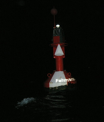 Um 2215 legen wir ab. Eine saukalte, sternenklare Nacht empfängt uns im Fahrwasser "stadtauswärts". Wir hangeln uns, den Blick rückwärts auf die Richtfeuerlinie, raus aus Burgstaaken, ändern den Kurs in den weißen Sektor bis wir den roten Sektor der Ansteuerungstonne Burgstaaken passiert haben. Danach rüber zum Fehmarnsund und "rauf" zur Brücke. Vor uns, in Richtfeuerlinie 305 Grad das Unterfeuer Strukkamphuk und das Oberfeuer Flügge. Faszinierend, aber die in Linie zu halten ist gar nicht so leicht. Unterwegs kein Fahrzeug, außer vielleicht die schnelle MIR oben am Sternenhimmel.