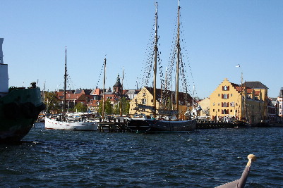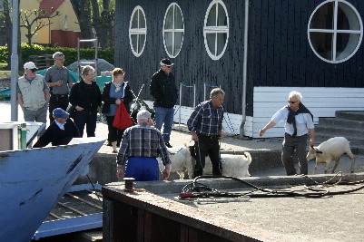 Hier werden wir Zeuge diverser Schleppmanöver. Links im Bild werden Ziege und Schafe verladen, die den Sommer auf den kleinen unbewohnten Inseln verbringen werden, ein dänischer Almauftrieb sozusagen.  Oben rechts schleppt die kleine „Malou“ einen Frachter aus der Reparatur wieder ins Fahrwasser und links die „Bella Vista“. Ein klassischer Marstalschoner, der als Exponat des Seefahrtmuseums hier mit historischen Werkzeugen wieder aufgebaut wird. Im nächsten Jahr soll der Schoner wieder seinem Element übergeben werden. Da wäre ich gern dabei.