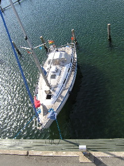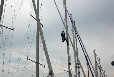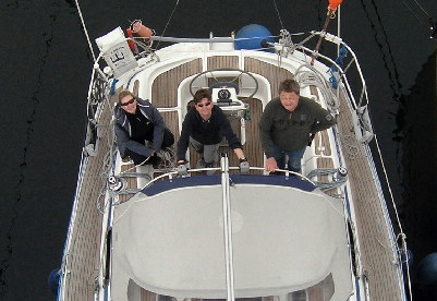 Ausgeschlafen hievt die Crew ihren Skipper in den Mast, damit der defekte Radarreflektor ausgetauscht werden kann. Dies ist nicht unbedingt Bestandteil eines SKS-Törns, aber ganz sicher eine interessante Erfahrung – jedenfalls, wenn man den Skipper endlich mal ganz allein in der Hand hat. Nicht vergessen: Immer eine doppelte Sicherung!