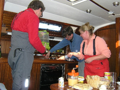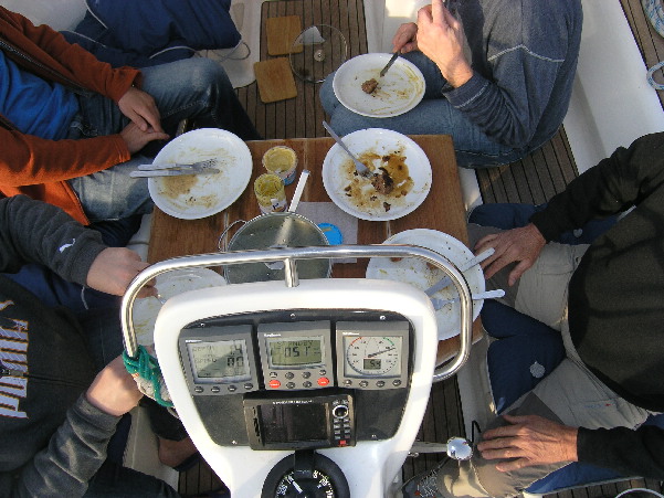 Die Crew zaubert zudem noch ein leckeres Menue aus den Tiefen von Kühlschrank und Schapps. Wir genießen den Abend und zum Nachtisch serviert Ralf Seemannsgarn ohne Ende.