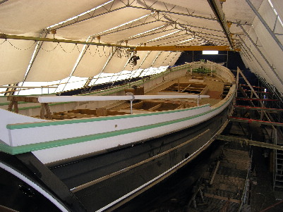 Oben rechts schleppt die kleine „Malou“ einen Frachter aus der Reparatur wieder ins Fahrwasser und links die „Bella Vista“. Ein klassischer Marstalschoner, der als Exponat des Seefahrtmuseums hier mit historischen Werkzeugen wieder aufgebaut wird. Im nächsten Jahr soll der Schoner wieder seinem Element übergeben werden. Da wäre ich gern dabei.