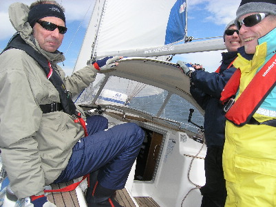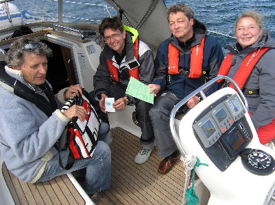 Da wir hier nicht detailliert über Prüfungsabläufe berichten, aber doch so viel: Nachdem alle Manöver und Fragen erfolgreich absolviert sind, gibts außerhalb der Prüfung noch einen oben drauf. "Dann starte mal die Maschine, lass die Segel bergen und fahr' mich zur nächsten Yacht da drüben am Deviationsdalben", empfängt Burkhard am Ruder noch eine Order vom Prüfer. Viel Arbeit für die kleine Crew und mittendrin geht beim Segel bergen überraschend die Boje über Bord: „Boje über Bord an Steuerbord.“ Jetzt kommt doch noch mal Adrenalin ins Spiel, doch auch dieses Manöver bringt die Crew nicht mehr vom Kurs ab. Klar, wann geht jemand über Bord? Wenn gearbeitet wird, aber das ist es dann wirklich. Die Drei haben natürlich bestanden, bekommen ihre Tickets und schon ist Richard Jeske (u.l.) auf ein andere Yacht über gestiegen. Glückwunsch und allzeit gute Fahrt!