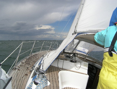 Unterwegs suchen wir den optimalen Segeltrimm und steuern nur noch nach den Fäden im Vorsegel. Die Fäden müssen natürlich optimal auswehen und die Innenfäden dabei leicht steigen, dann stimmen Trimm und Kurs überein.