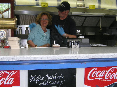 Regina und Uwe (links) kennen die spannendsten stories von der Insel. Ganz besonders interessiert uns der Untergang der legendären „Bärbel“. Der Futterkutter war im tiefen Winter mitten im Hafen gesunken, weil ein Ventil undicht war. Dieser Mangel wurde zwar rechtzeitig erkannt, ... aber leider nicht behoben. Inzwischen ist die „Bärbel“ verschrottet und Geschichte …