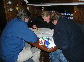 So viel Wind und dann Notmanöver bei 6 Bft.? Das passt auch. Quickstop? Nie gehört! Rechts die intensive Vorbereitung auf die Nachtfahrt.
