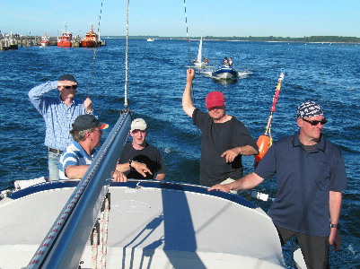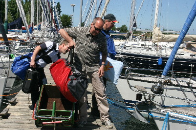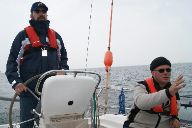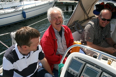 Dann bekommt Ralf Besuch von seinem Freund Uli (links) und die Crew gleich mit. Geschichten aus dem Leben eines Einhandseglers und der Besuch auf seiner "Mercy" bilden eine interessante Ergänzung des Trainings. So ganz nebenbei hat Uli jede Menge Fotos von unseren Manövern geschossen. Dafür und für den herrlichen Rotwein herzlichen Dank.
