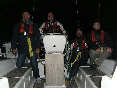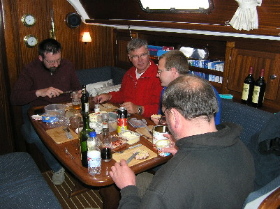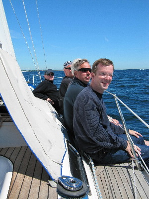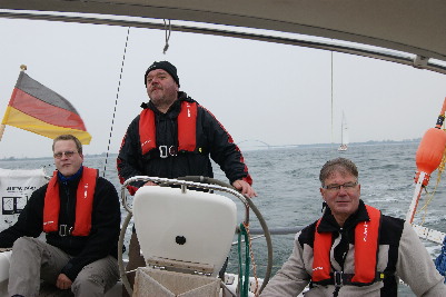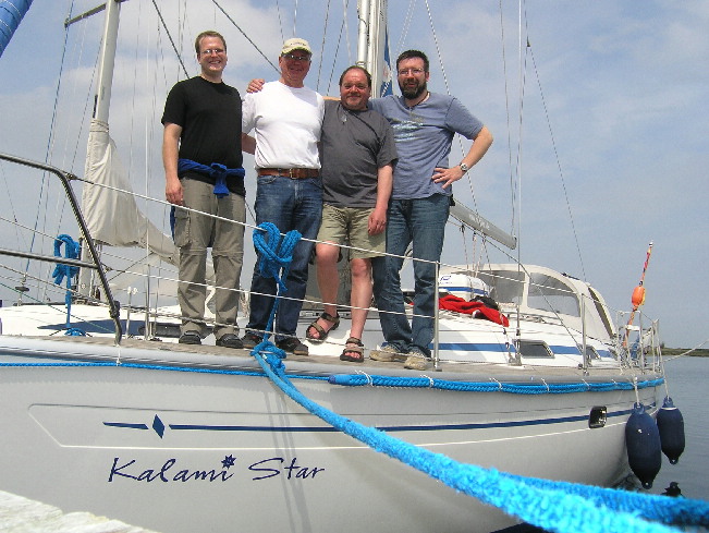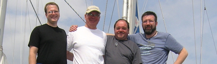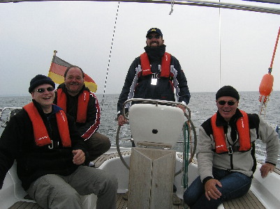 Peter ist mit an Bord, Matthias, Felix und Michael - nebenbei auch noch Smutje - prima. Alle bereits erfahren, dazu neugierig und hoch motiviert. Aber Wundertüte? Naja, keiner kennt halt den anderen. An Bord dann Teambildung vom Feinsten mit Bonn, Nürnberg, Berlin, Zwickau und dem Skipper aus Hannover. Klappt prima.