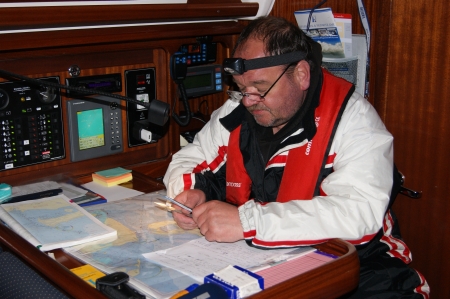 Um 2200 geht’s von Burgstaaken aus rein in die Nacht. Und plötzlich kommt die SKS-Theorie mit der Kartenaufgabe „Von Travemünde zum Kleinen Belt“ mit an Bord. Aus Theorie wird plötzlich Praxis und die Rolle als Navigator oder das Steuern nach einer Richtfeuerlinie erweist sich ganz schön schwierig. Dennoch, um 0030 sind wir wieder fest am heimatlichen Steg. Gute Nacht.