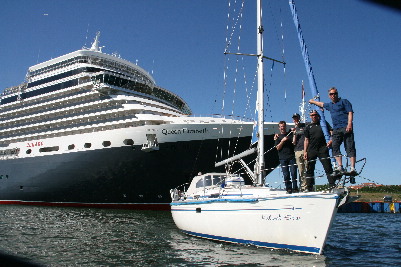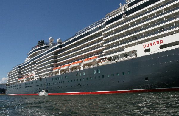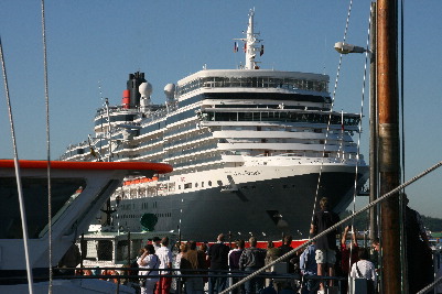 Gegen 1000 legen wir ab und wollen uns die Queen mal aus der Nähe ansehen. Zu diesem Zweck „schmieren“ wir einen jugendlichen Schlauchbootkapitän, der unseren Fotografen Paul für 5 € mit an Bord nimmt. Wie klein wir doch neben diesem Riesen sind.
