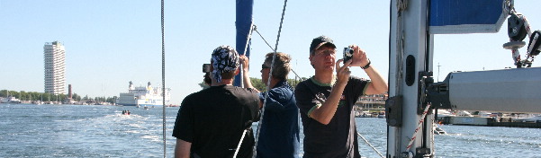 Ein Foto von den Trainings haben wir noch. Der Skipper wird immer wieder die „Boje über Bord“ werfen und darf sie dann auch gleich selbst wieder aufnehmen. Wie, ohne Schwimmweste? Peinlich!